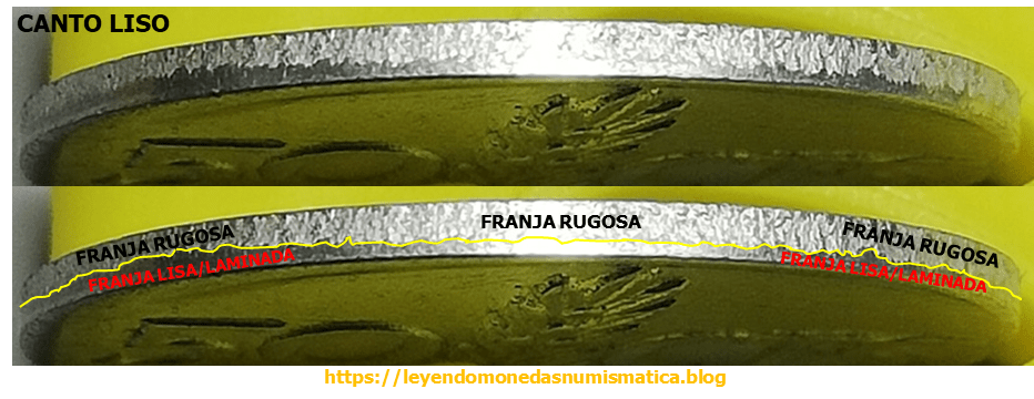 3) Canto liso siempre sin acuñar por virola. Al no haber virola durante la acuñación del cospel, el cospel mantendrá el diseño del canto tal como entro en la cámara de acuñación sin virola. En este caso, los 50 Céntimos presentan el canto dejado tras el el recorte del riel. Es un canto dividido. con dos franjas, fruto del recorte del riel. ACUÑACION A MOLINO. El recorte de la moneda. La división del canto.