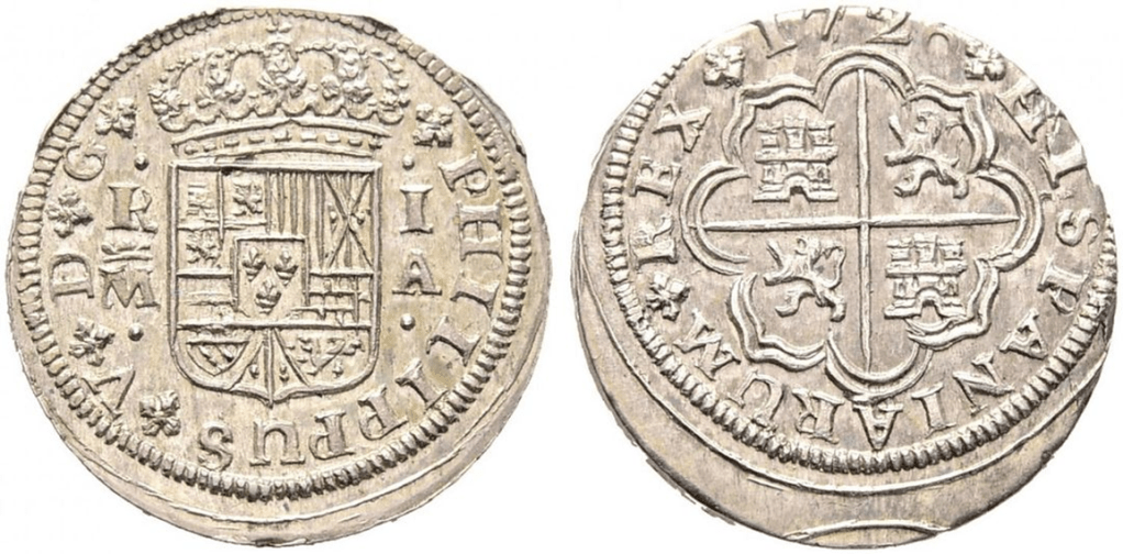 Hay elementos del diseño diferentes en los Reales de a 1 acuñados en 1721 y 1726 . La corona del anverso es distinta en diseño, la marca de ceca (M coronada),… pero que haya diferentes diseños, no evita que se reutilicen los recursos existentes de la ceca, en este caso Cuños Rodillo.