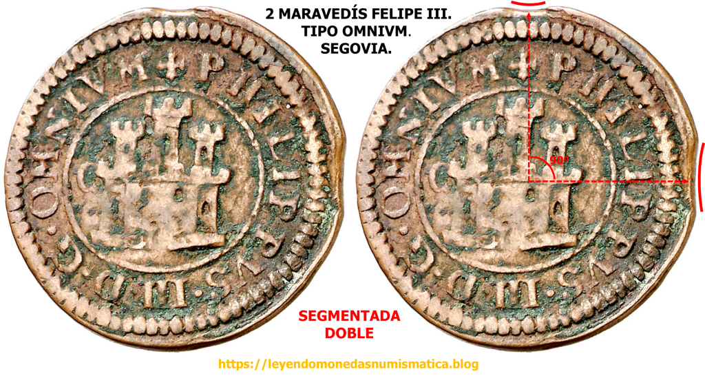 La pieza acuñada a Molino, 2 Maravedís, presenta dos muescas circulares a 90º. Eso significa que había grabados a ambos lados de la muescas. ¿Por que?. Porque la muesca es consecuencia del recorte de otro Grabado/moneda del riel. Si había grabados a ambos lados de las muescas, significa que el riel constaba de dos filas de grabados. Luego los restos de rieles/cizallas de doble grabado, y los dos Maravedís Segovianos doble segmentados, nos dicen que se emplearon Cuños Rodillo con Doble Grabado en la Acuñación a Molino.