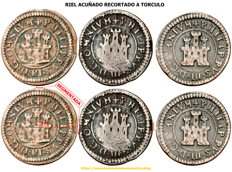 2) Existe cizalla, que demuestra que en la Ceca de Segovia se acuñaron rieles con doble Grabado. 2 Maravedís Felipe III. Tipo OMNIVM. Segovia. DOBLE SEGMENTADA . ACUÑACION A MOLINO.