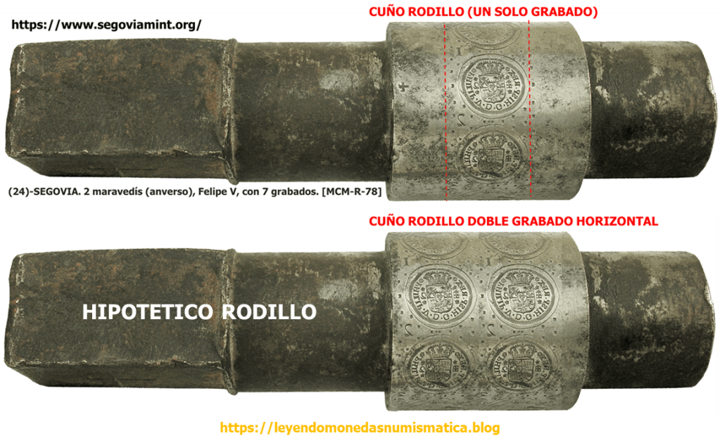 Los Cuños Rodillo, en principio, solían tener un único grabado a lo largo de la curvatura perimetral del rodillo. Pero las monedas 2 Maravedís Felipe III. 1598. Tipo OMNIVM. Segovia. RIEL DOBLE GRABADO. ACUÑACION A MOLINO. 2 Maravedís Felipe III. Tipo OMNIVM. Segovia. DOBLE SEGMENTADA . ACUÑACION A MOLINO. , y la cizalla encontrada en Segovia, delatan, que Segovia elaboro Cuños Rodillo con Doble Grabado horizontal. El Cuño Rodillo con Doble Grabado, presenta dos filas de grabados en la superficie a lo largo de su curvatura. Es decir, hay dos grabados, un par de grabados, uno al lado del otro lateralmente, perpendiculares a la dirección del movimiento de los rodillos.