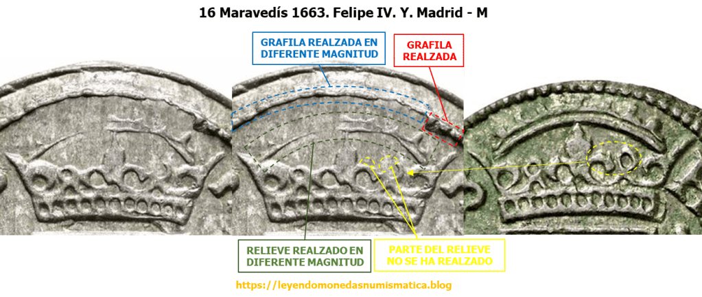 Los siguientes 16 Maravedís acuñados a molino, en la Ceca de Madrid de la puerta de Alcalá (16 Maravedíes. 1661. Y. MD. Madrid. ACUÑACION A MOLINO.), en 1663, durante el reinado de Felipe IV, presentan en su reverso una mala acuñación en una zona/área. La corona y parte de la grafila encima de la corona, presentan una acuñación deficiente. Algunos relieves no se realzaron, otros apenas y otros un poco. ¿Cuál puede ser la causa de que este área del trazo rojo de la imagen no presente los relieves realzados?.
