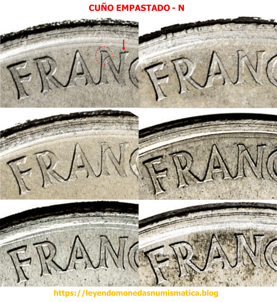 Las diferentes N de la imagen, pertenecen a diferentes piezas de 100 pesetas 1966*19-69 Palo Recto, con el exceso de metal en el labio. Parece ser que hay un empaste de cuño, que da lugar a que la N de FRANCO, no se acuñe bien en algunas piezas de la tirada del palo recto.