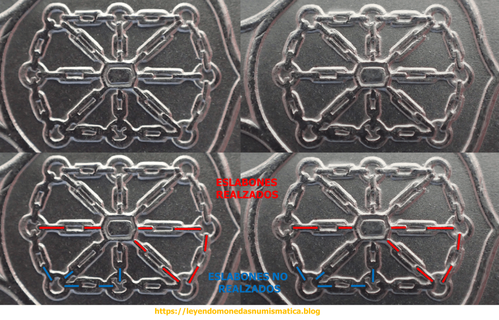 Las flechas rojas, muestran la altura de los eslabones acuñados, realzados, en relieve. Las flechas azules señalan las areas donde debería haber eslabones en relieve. Esos relieves no acuñados, no realzados en la moneda, son la parte mas profunda en hueco del cuño. Parece ser que alguna sustancia (suciedad, grasa, aceite,… ) taponó, se alojó en el huecorrelieve del cuño y evitó la entrada de metal (cospel).