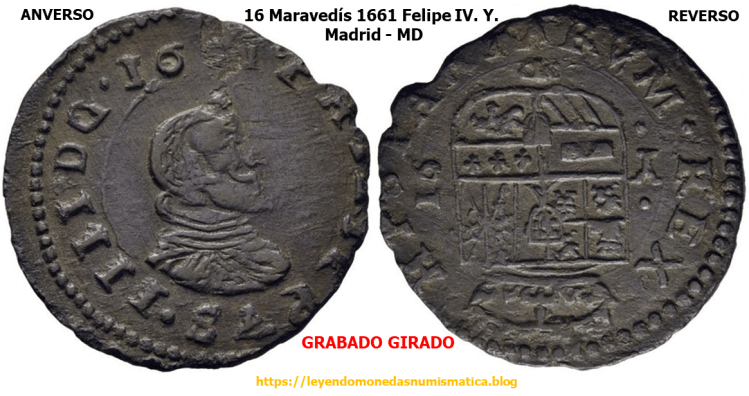 La pieza no presenta una alineación medalla de anverso y reverso. Esto puede ocurrir en la acuñación a molino, y de hecho hay piezas de 16 Maravedís de la misma ceca y año con el mismo error – 16 Maravedíes. 1661. Y. MD. Madrid. ACUÑACION A MOLINO.