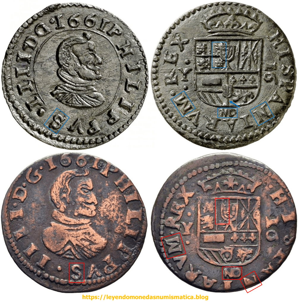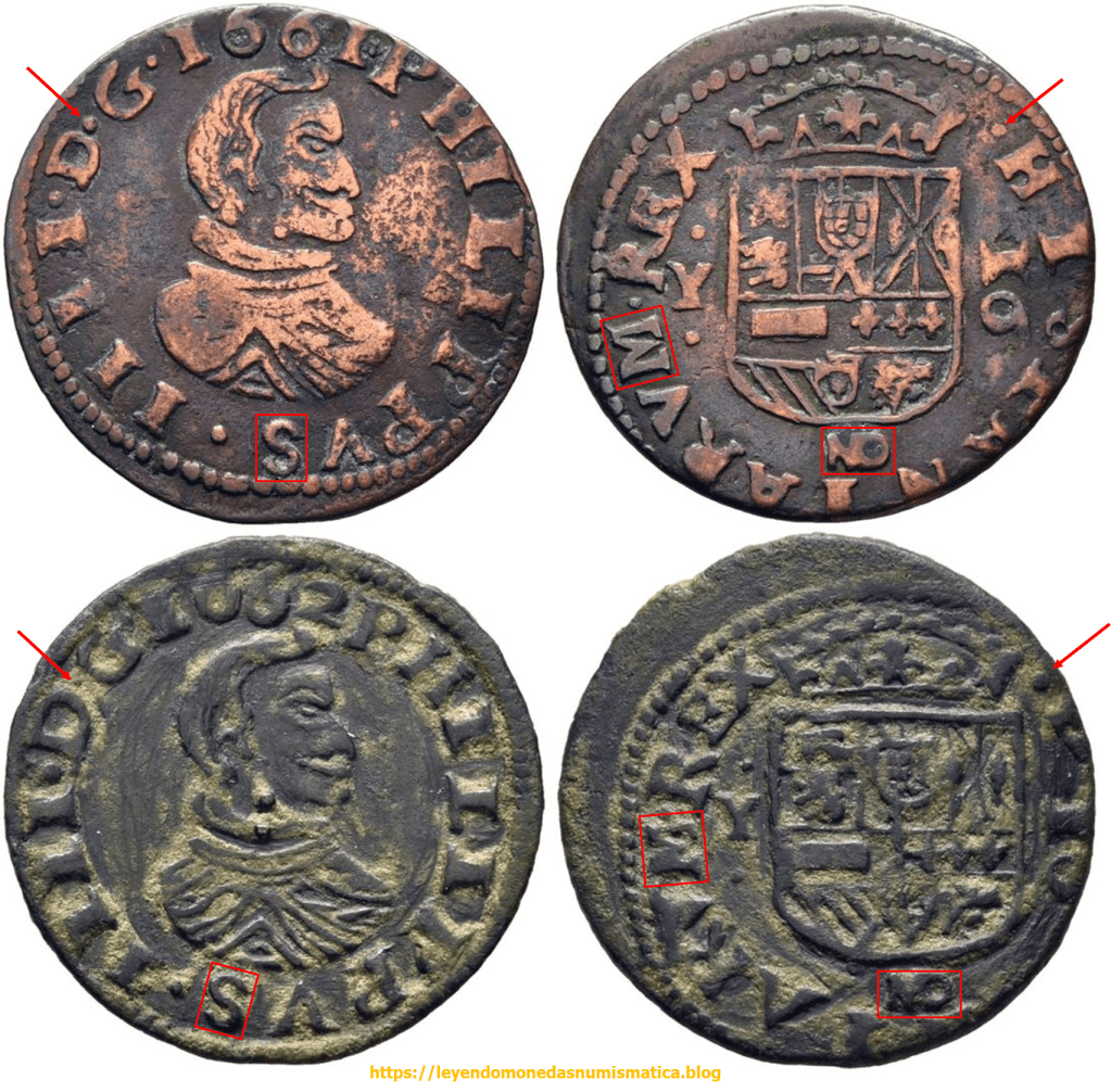Ambas piezas comparten el mismo diseño para el busto, pero hay mas relieves con mismo diseño. La corona del reverso, la M de HISPANIARVM, la marca de Ceca, la S de PHILIPPVS,…