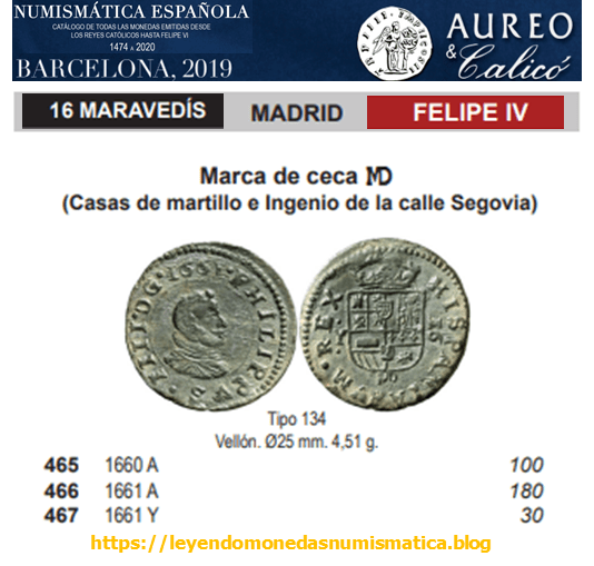 La siguiente pieza, 16 Maravedís 1661 Felipe IV MD – 16 Maravedíes. 1661. Y. MD. Madrid. ACUÑACION A MOLINO. , fue subastada en 2019. MD – Casa de Molino del Puente de Segovia (Calle Segovia).