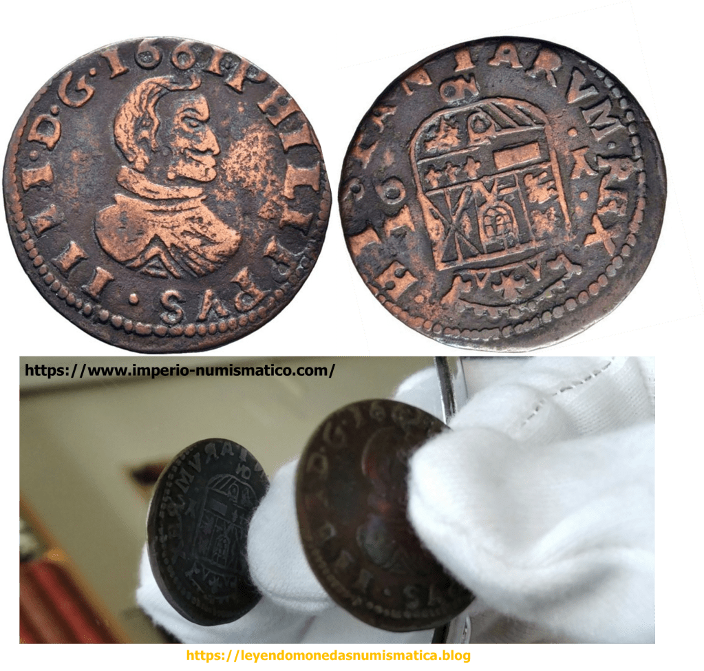 Llama primeramente la atención el busto, lo que lleva a pensar en una posible falsificación. El peso es bajísimo, 2,79 gramos de un peso oficial de 4,50 gramos. – https://www.imperio-numismatico.com/t155032-16-maravedis-madrid-1661-casa-de-molinos-de-la-calle-segovia-falsa-de-epoca