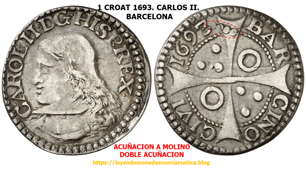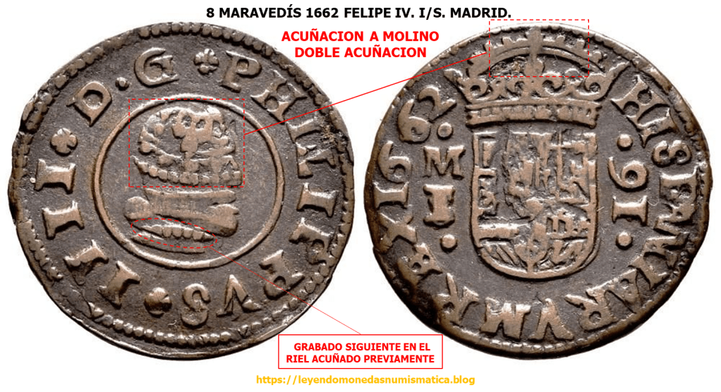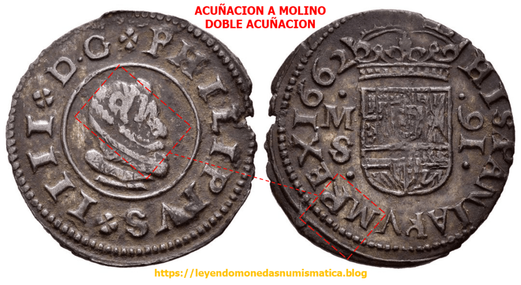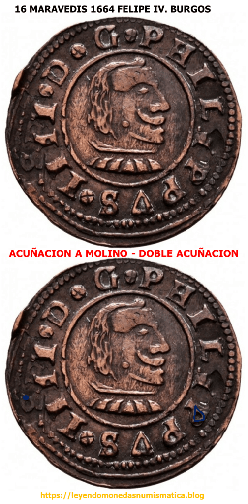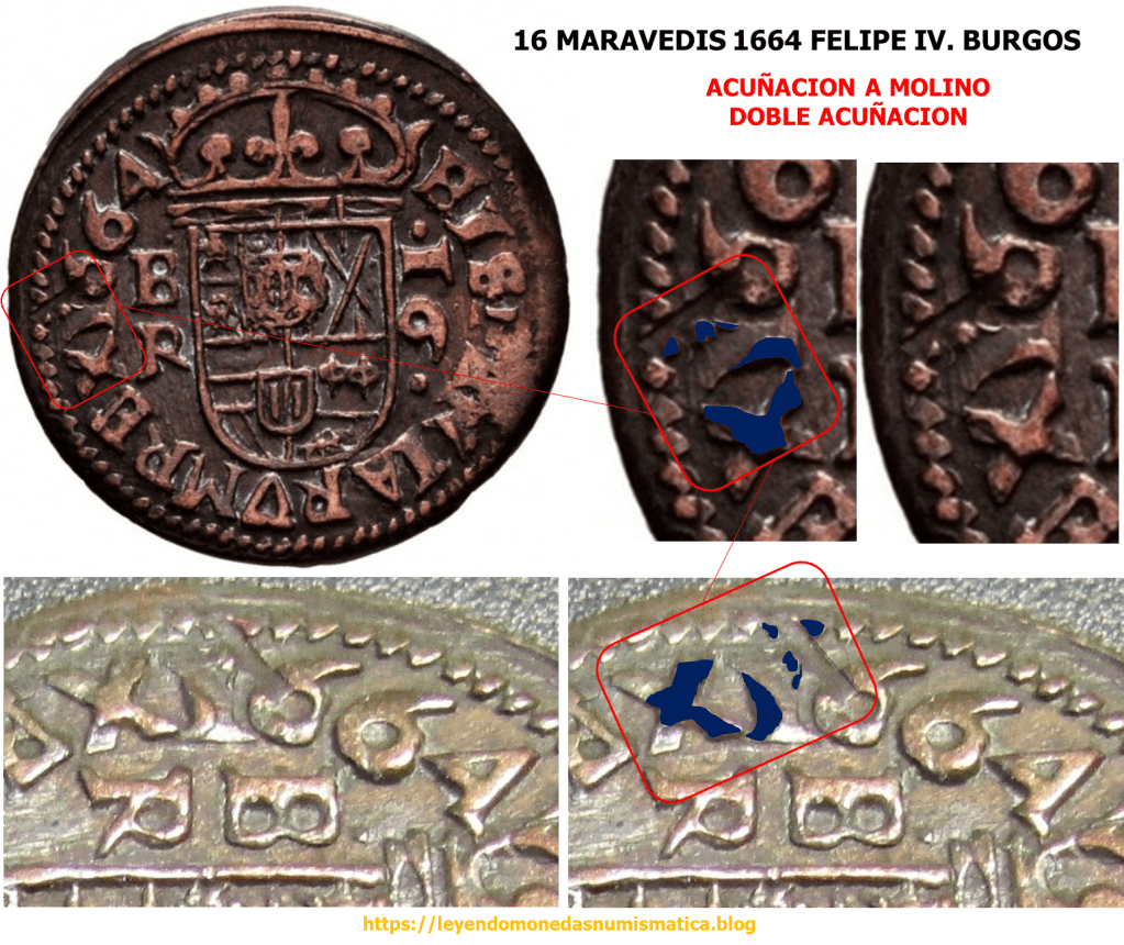 El trazo azul sobre la primera P de PHILIPPVS, señala un relieve de la primera acuñación del riel. Parece el digito 4.