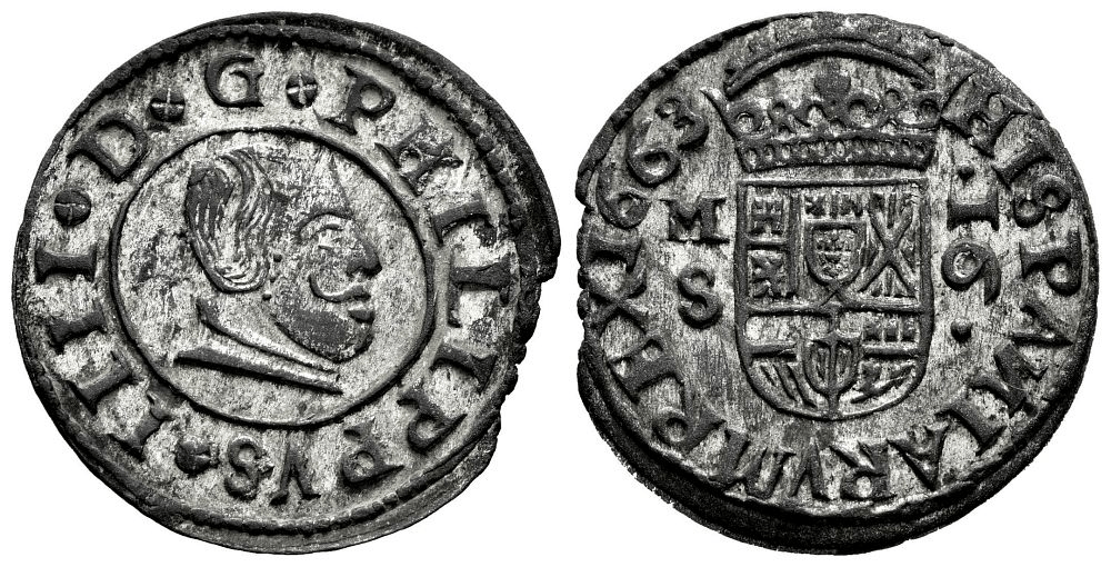 Acuñados a Molino, en aleación de cobre y plata, son las monedas de Vellon con busto de Felipe IV. Todas las monedas de vellón, aunque llevan una pequeñísima cantidad de liga de plata, tiene que llevar la sigla del ensayador, desde los Reyes Catolicos.