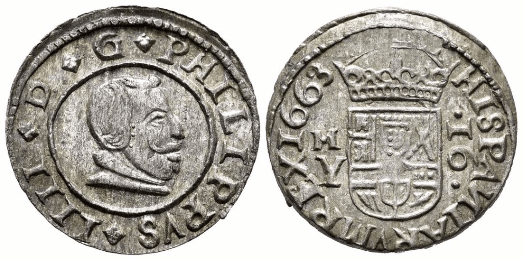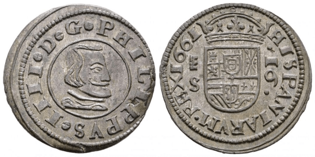Fuente – CIRCULACIÓN DE MONEDA FALSA DEL SIGLO XVII EN LOS SANTOS DE MAIMONA (BADAJOZ): EL TESTIMONIO DE UN “VELLÓN” DE 16 MARAVEDÍS DE FELIPE IV. Rogelio Segovia Sopo.