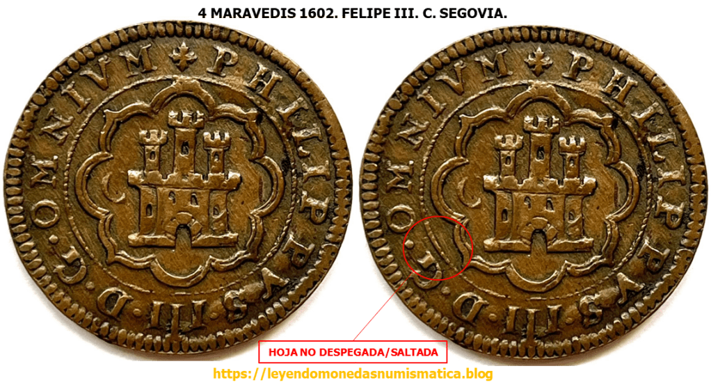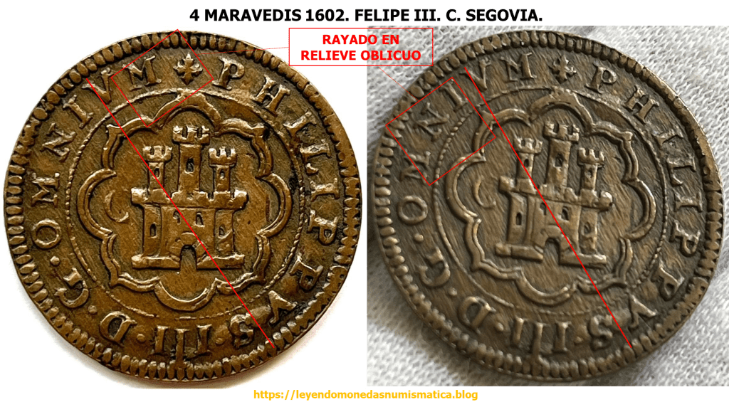 Hay piezas de maravedís con el mismo rayado. A veces es muy fino o ligero, e incluso locali-zado en ciertas áreas. Parece ser, que el troquel ha sufrido un rayado (pulido) fuerte. Esto también ocurre en los troqueles de las acuñaciones a martillo y a Volante. En la siguiente pieza, se aprecia el rayado en ambas caras.