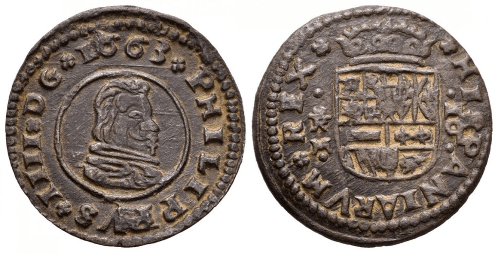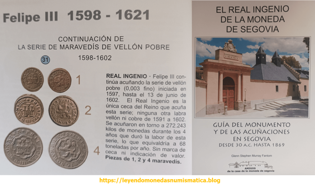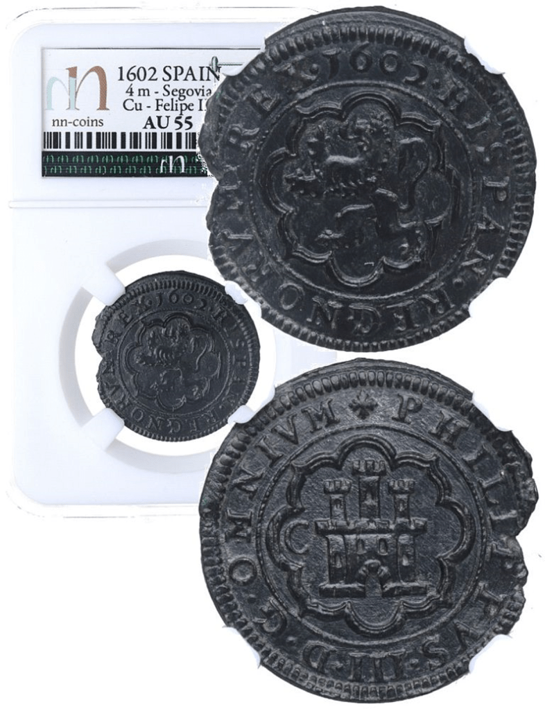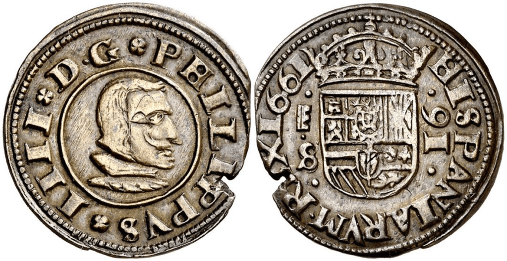 La siguiente pieza fue acuñada a rodillo en la Ceca de Segovia en 1602, durante el reinado de Felipe III. El ensayador es Melchor Rogríguez del Castillo, representado por la sigla C. El canto es liso (consecuencia del recorte del riel acuñado).