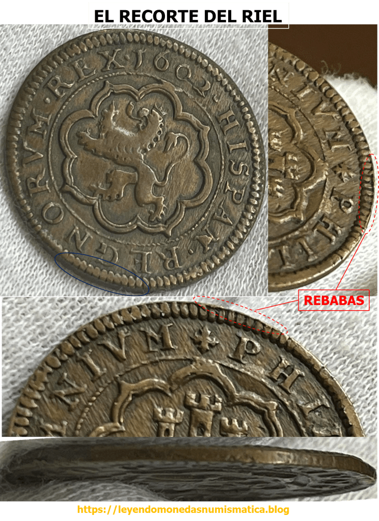 El anverso del riel, fue el que se enfrento al punzón de corte del Tórculo. Las rebabas son la prueba de ello. El trazo rojo señala la rebaba tras el recorte del riel. Debido a la circulación de la pieza, las rebabas pierden su forma afilada. El trazo azul del reverso, señala el corte en el área de la grafila, y es un punto que delata la autenticidad de la pieza.