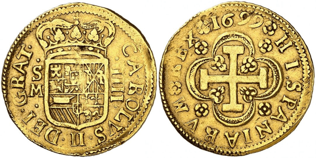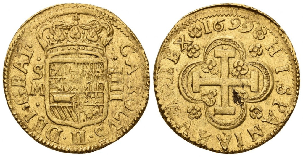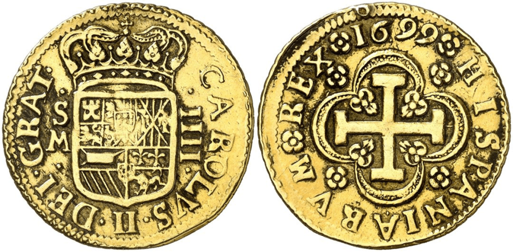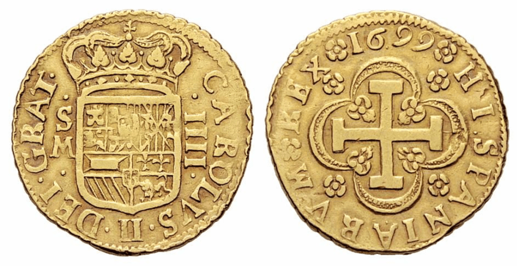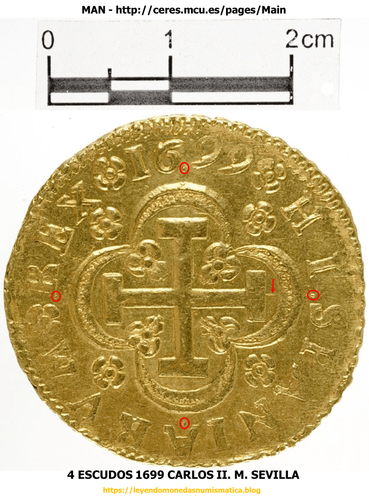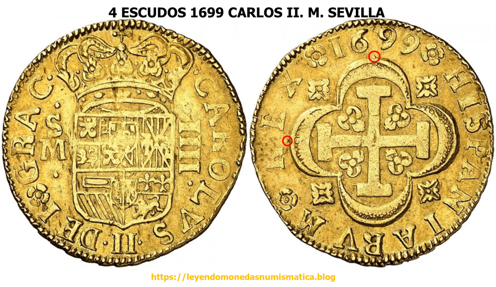 En 1699 se acuñaron en Sevilla, escudos de a 4. Voy a leer todas las piezas que conozco. 5 han aparecido en Subastas. Una hay en el Museo Arqueológico de Madrid (MAN).