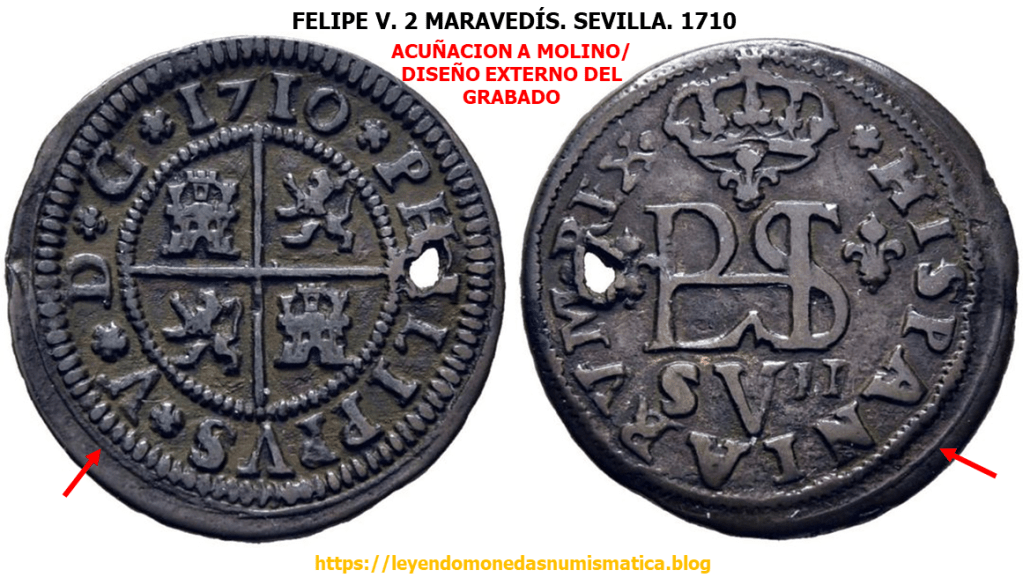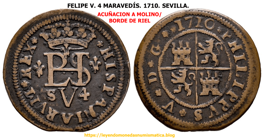 En 1710 en Sevilla, en su Casa de la moneda, a nombre de Felipe V, se acuñaron en cobre piezas de 2 Maravedís con un modulo de 2 mm, y piezas con un modulo de 26 mm de 4 Maravedís. Estas piezas presentan el canto liso.