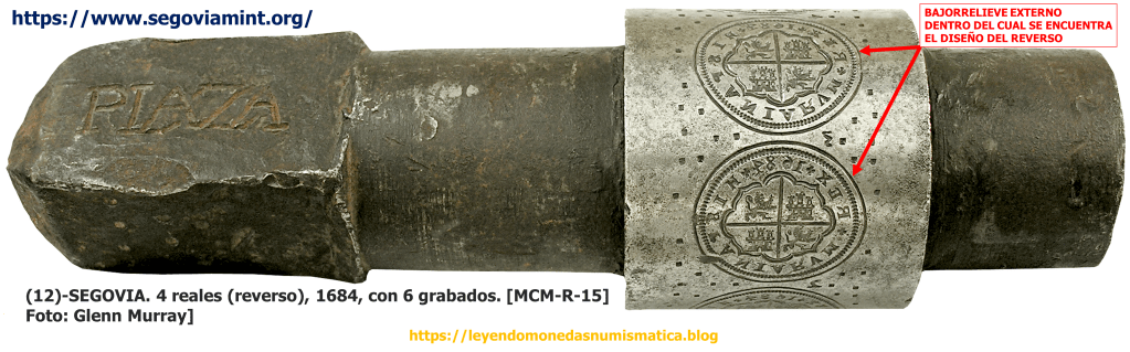 La pieza fue recortada después de su acuñación. Eso delata que se acuño un riel. ¿Por que se puede decir que la pieza fue recortada después de la acuñación (del riel)?. Las flechas rojas, señalan el área del perlado que no ha sido acuñado entero. Las perlas están partidas. Sin embargo, vemos que el hueco que hay entre perla y perla, al llegar al borde de la pieza, se realza en relieve. La acuñación del troquel (Prensa a Volante) no hubiera dejado ese relieve en el borde (flechas rojas), sino que hubiera tendido a mantener la altura del acuñado entre perla y perla. En la acuñación a Volante el cospel se recorta antes de la acuñación.