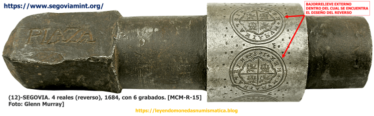 Las flechas azules en anverso y reverso, señalan un punto en relieve. En principio, y leyendo otras piezas, se puede decir, que dichos detalles en relieve, son parte del proceso de elaboración del Cuño rodillo. Son detalles, que pertenecen a la operativa, a la hora de elaborar cada grabado en el rodillo. Son detalles que parece ser, que sirven de guía, de referencia, a la hora de emplazar el Grabado, de centrarlo en el rodillo. Son el inicio del Grabado en Rodillo. Parece coincidir con el centro del Grabado, en principio, es un punto importante, es un punto de referencia (centro geométrico). Es importante, por el método de elaboración del Cuño Rodillo. El Cuño Rodillo se elabora a buril/hincado punzones. Seguramente desde el punto central, se han trazado elipses (compás), para ayudar a posicionar los bajorrelieves (orlas, grafilas, leyenda,…). El punto central esta en relieve, en altorrelieve en la moneda, luego esta en el Cuño Rodillo. En el Cuño Rodillo esta en bajorrelieve. Aunque aparezca en algunas piezas, no forma parte del diseño de la moneda. Estos puntos se realizan antes de que los bajorrelieves del cuño sean grabados. El punto esta relacionado con el proceso de fabricación del cuño.