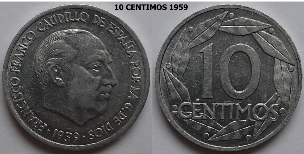 El 11 de mayo de 1959, una Ley aprobada en las Cortes Españolas, ponía en marcha la acuñación de las nuevas monedas de 10 Céntimos. Disposiciones legales, fueron ampliando la tirada en años posteriores,hasta sobrepasar los 1.240 millones de piezas. La misma Ley, privó de curso legal a las monedas de aluminio de 5 Céntimos del tipo «jinete con lanza».A parte de para moneda fraccionaria, se acuño también en calidad ARM. Se hicieron algunas en plata y pruebas en cobre.