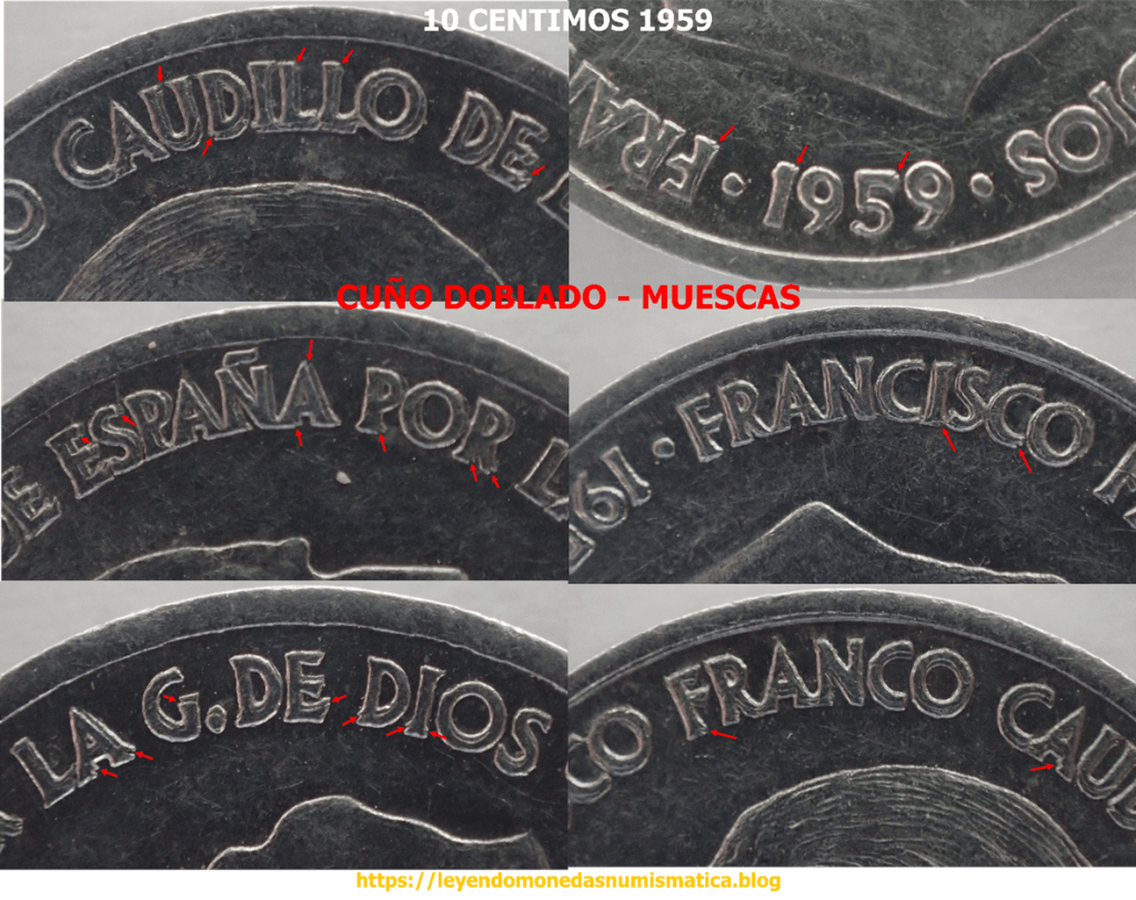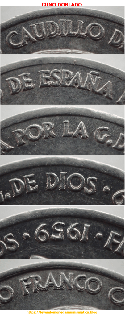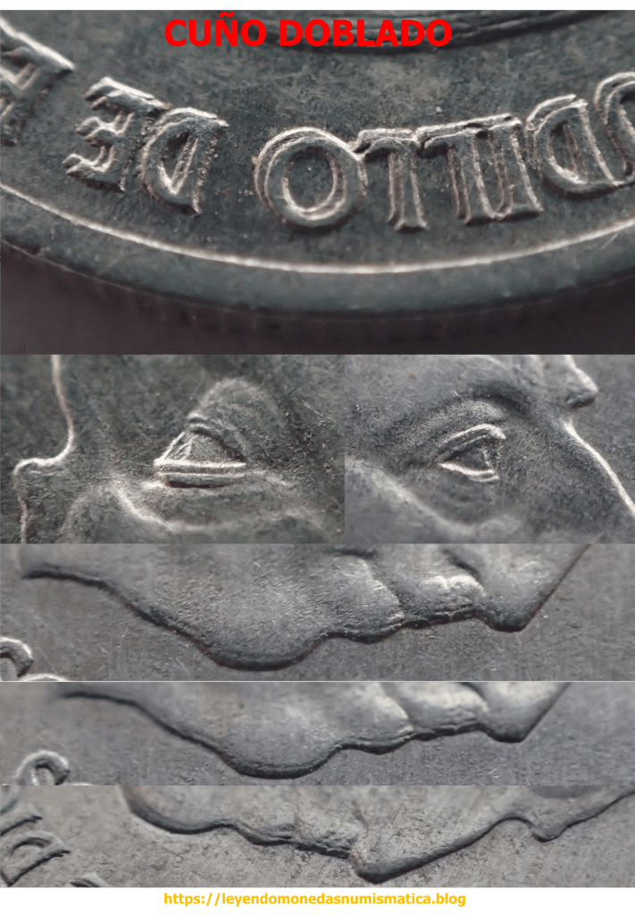 Se aprecia muy claramente la divergencia del hincado del Punzón de trabajo entre hincados. Las flechas rojas muestran en los extremos de los altorrelieves de la leyenda, esa no coincidencia entre hincados. Cuando llega a nivel del campo de la moneda dicha divergencia, es cuando mas fácil se aprecia esta (muescas). Esa divergencia de las improntas que ocurrió durante el hincado, aumento los bajorrelieves del cuño. Se han doblado las improntas en el cuño. En principio, todas las monedas acuñadas con el cuño de anverso que acuño esta pieza, tendrán el mismo error tanto en posición como en tamaño.