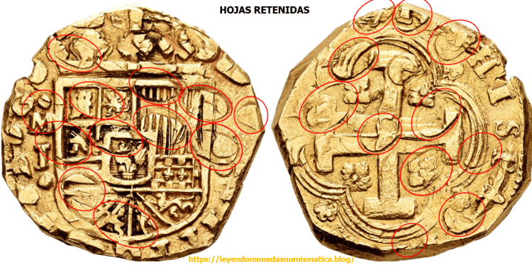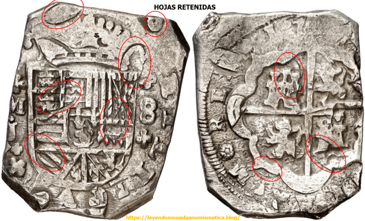 LA ROTURA DEL COSPEL – Hoja Retenida; La superficie de la moneda presenta una o varias roturas. La moneda presenta, defectos o grietas leves en su superficie. El metal de la moneda/cospel, no se ha desprendido. Puede ocurrir en una, o en ambas caras. La impureza en la moneda está o estaba, justo debajo de la superficie agrietada, rajada,…, pero no se desprende metal. Es una hoja no saltada. Es un error de laminación retenido, es una escama/lamina que permanece adherida a la moneda. Ejemplos de Hojas Retenidas.