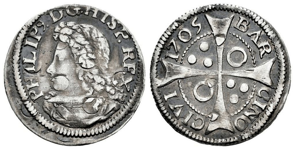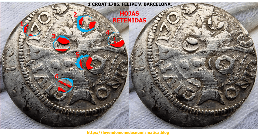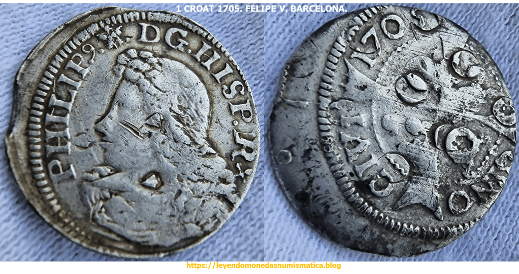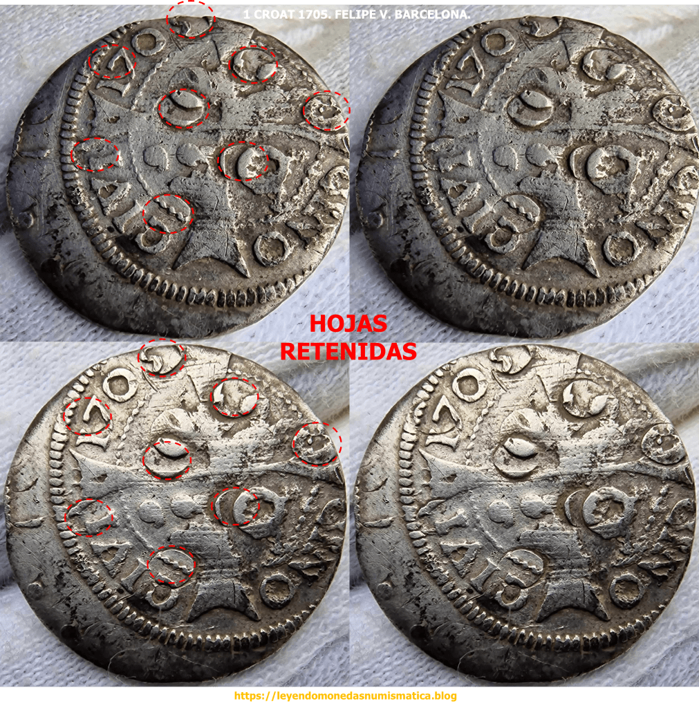 La siguiente pieza acuñada a Molino en 1705 ( 1 Croat 1705. Felipe V. Barcelona. Punto entre Grabados. Acuñación a Molino. ), presenta en el reverso un agrietamiento del metal.
