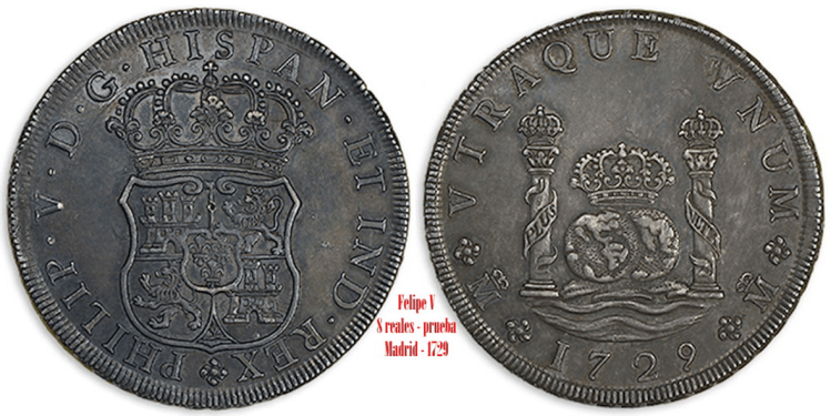 Hay un Columnario que tiene el mismo diseño de sus columnas, que el de los acuñados en Santa Fe de Nuevo Reino. Un Columnario acuñado en Madrid. El columnario de 1729. Se encuentra en el Museo de la Casa de la Moneda de México. Los 8 reales de Felipe V acuñados en Madrid en 1729. Esta prueba se envío a la ceca de México, para que sirviera de referencia, en la acuñación de los nuevos columnarios (que comenzarían en 1732). https://moneditis.com/2021/03/05/8-reales-columnario-1729/
