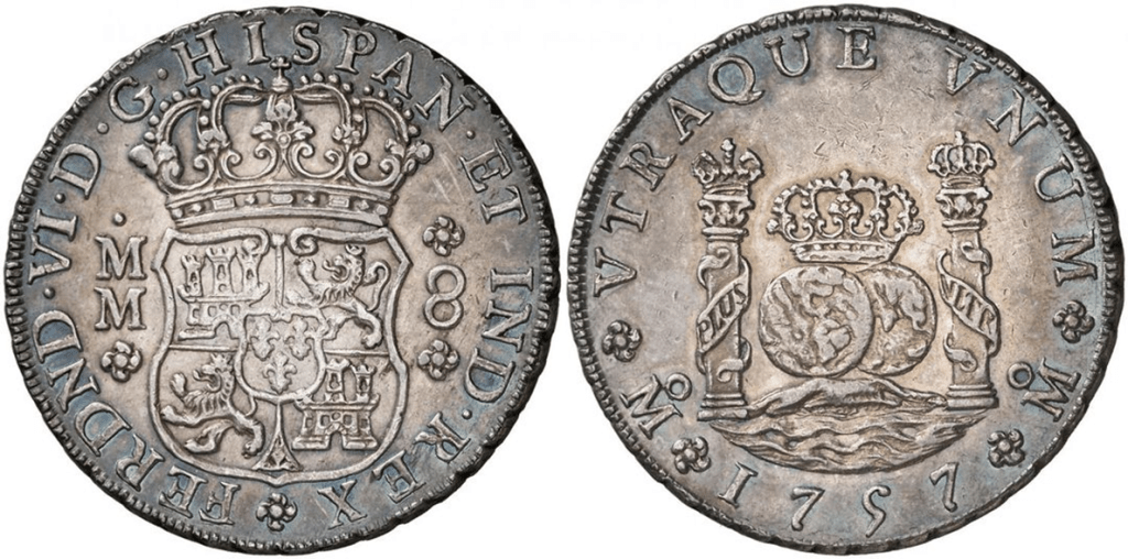 El trazo rojo señala el detalle que me sorprendió leer. Cada columna del reverso, es un punzón individual – 8 REALES COLUMNARIOS. 1749. FERNANDO VI.MEXICO. EL CUÑO DE REVERSO.