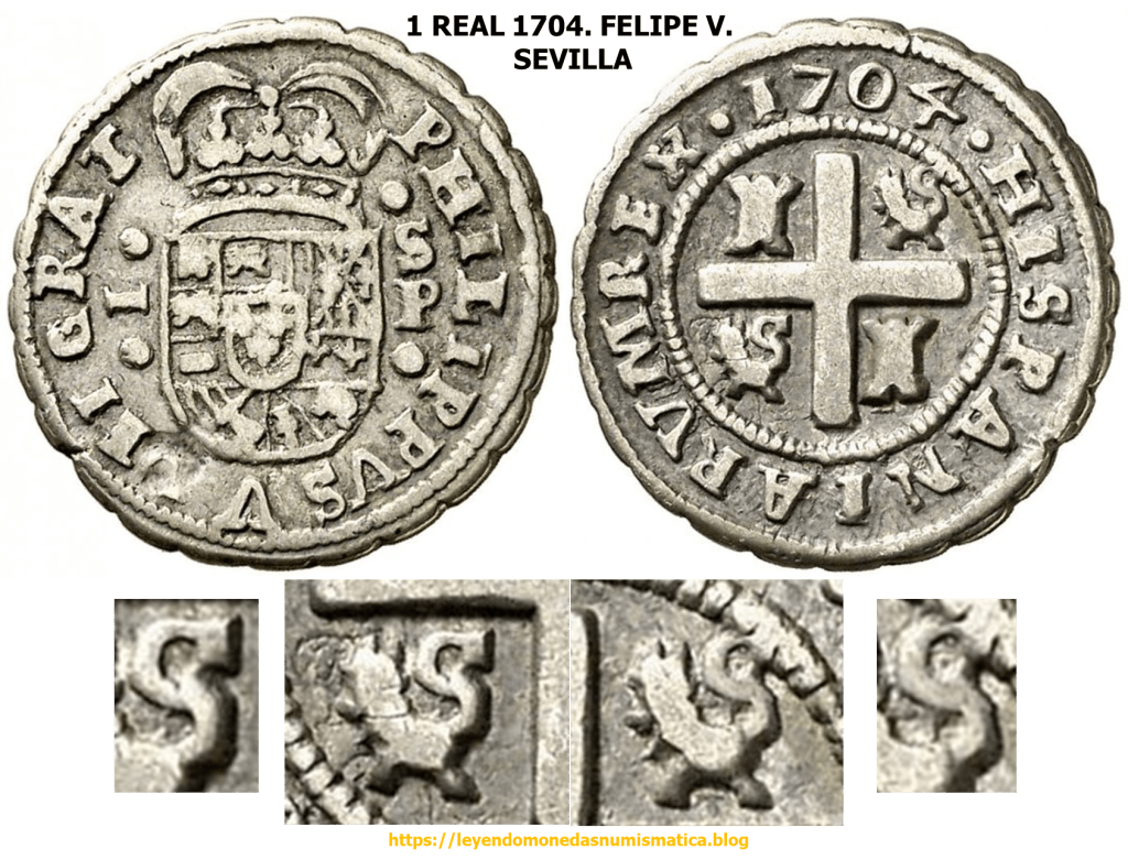 La siguiente pieza, acuñada en Sevilla durante el reinado de Felipe V, presenta un detalle curioso en el León (reverso).