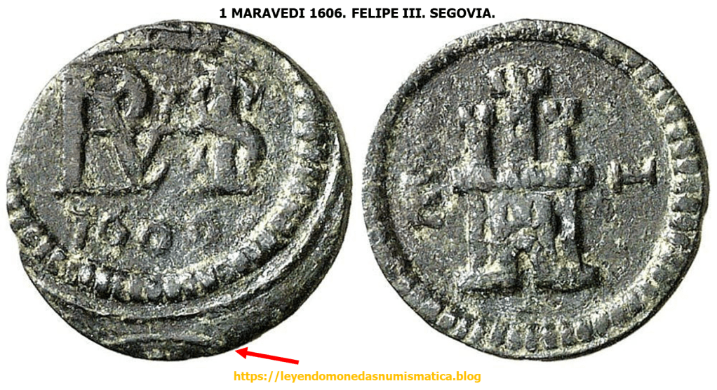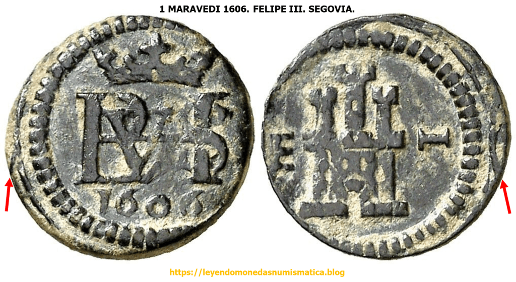 Estas piezas, en principio, fueron acuñadas en un riel de mayor amplitud horizontal, que para el modulo de una pieza. Es decir, el Cuño Rodillo presentaba Doble grabado horizontal. Esto ocurría en la Ceca de Segovia. – 2 Maravedís Felipe III. 1598. Tipo OMNIVM. Segovia. RIEL DOBLE GRABADO. ACUÑACION A MOLINO.