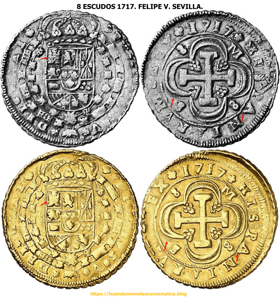 La posición de los relieves coincide en el anverso y reverso de ambas piezas. Además, hay detalles que delatan mismo origen de anverso y reverso de ambas piezas. Las flechas rojas señalan relieves doblados. El hincado del punzón para dichos relieves señalados con las flechas rojas, fue no coincidente. ACUÑACION A MOLINO. CUÑO RODILLO DOBLADO. GRABADO DOBLADO.