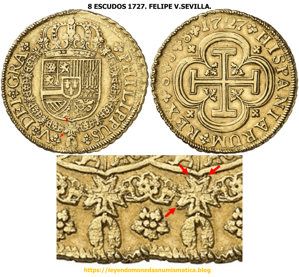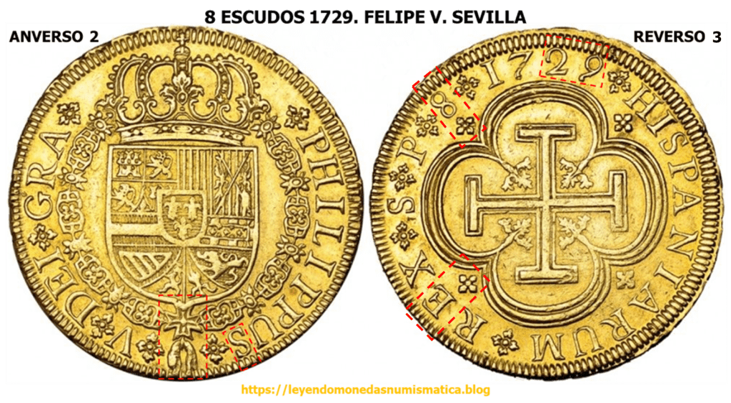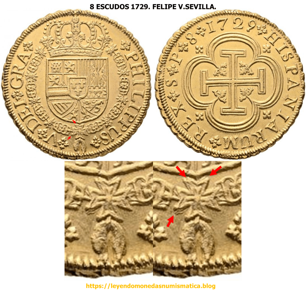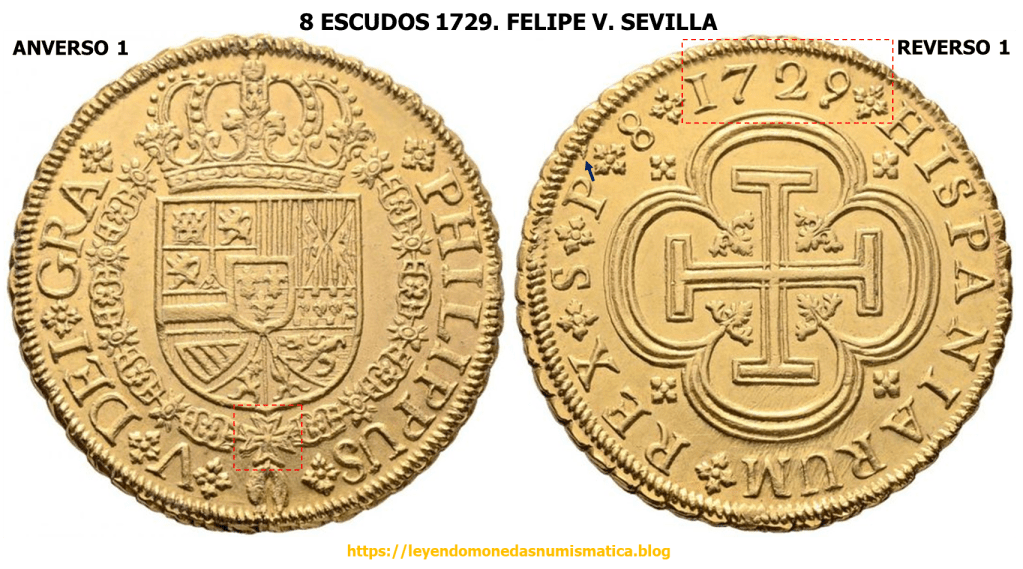 En 1729, se acuño el ultimo Doblón de a 8 Sevillano tipo Cruz. Ese mismo año, 1729, se empiezan a acuñar a Volante, los primeros Doblones de a 8 Sevillanos, con Busto del monarca. 8 ESCUDOS 1729. FELIPE V. SEVILLA. BUSTO. ACUÑACIÓN A VOLANTE SIN VIROLA. EL FLUJO DEL METAL.