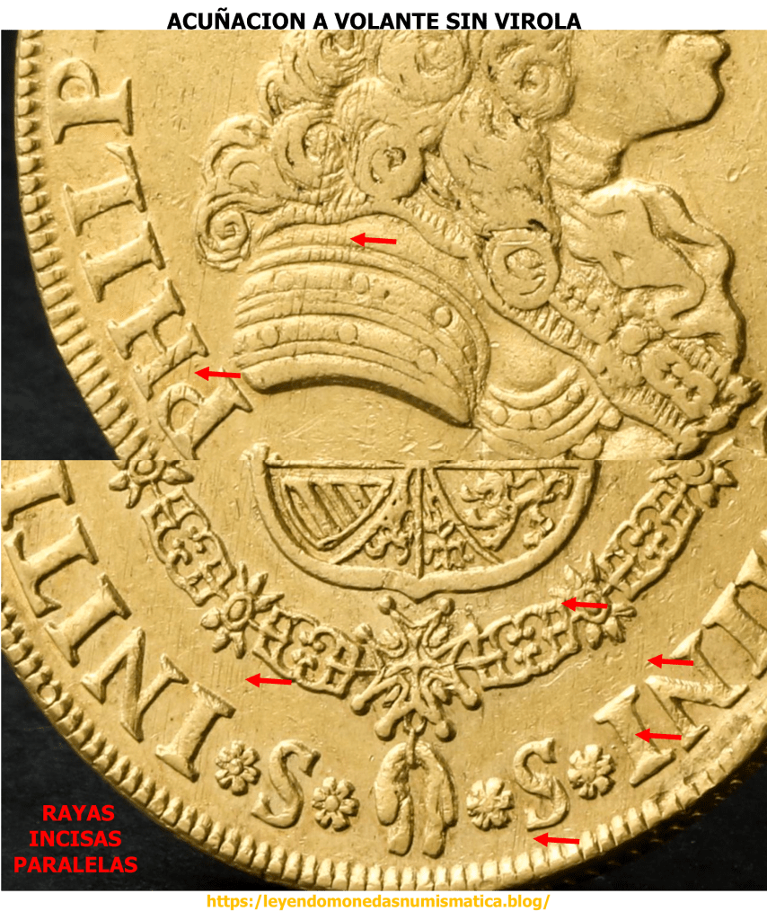 Ese rayado, en principio, es un error durante el proceso de acuñación. Es un error que se produce en la Ceca. No he encontrado Doblones de a 8 Sevillanos, de Felipe V, tipo Cruz, con dicho rayado. Ese es otro punto, que lleva a pensar en la Acuñación a Molino, de los 8 Escudos Sevillanos de Felipe V Tipo cruz, acuñados desde 1701 a 1729. DOBLÓN DE A 8. 1729. FELIPE V. TIPO CRUZ. SEVILLA.