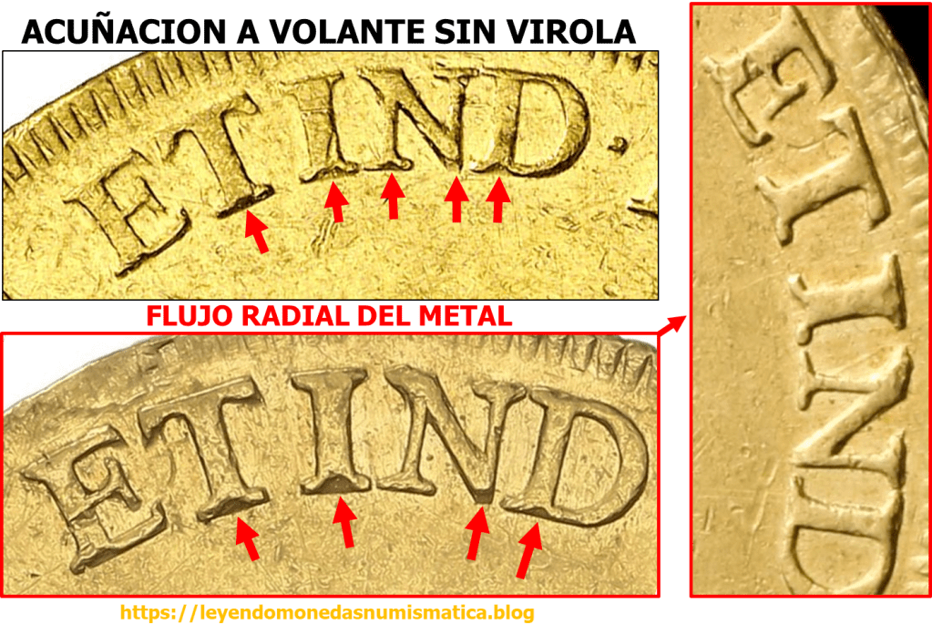En muchos Reales de a 8, de Carlos III, Carlos IV, Fernando VII,…y otras piezas acuñadas a Volante sin restricción de Metal (Virola), podemos apreciar bastantes veces, que algunas siglas, de una o ambas caras de la moneda, no se forman correctamente durante la acuñación del cospel. Puede ocurrir en distintas magnitudes, y en diferente numero de siglas. Depende básicamente de su acuñación en la prensa a volante de la época. De la tecnología empleada para su acuñación. Es una Acuñación a Volante (fuerza humana, animal,…) sin restricción de metal. En otras palabras, el cospel cuando se aloja sobre el cuño fijo, recibe el golpe del cuño superior/ móvil, pero nada detiene la expansión radial del cospel. Las bases de las siglas de la leyenda no se forman correctamente, esto delata la dirección radial del flujo del metal.