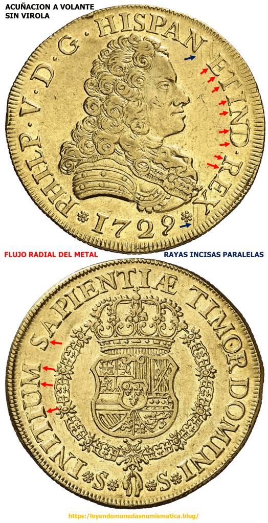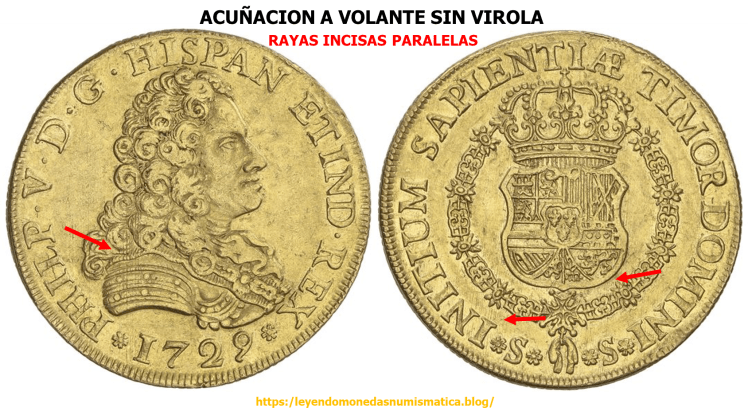 En 1729, en la Ceca de Sevilla, se acuña el primer Doblón de a 8 con Busto de Felipe V. La acuñación es a Volante sin Virola. En principio, el canto se cerrillaba antes de acuñar el cospel. LA CERRILLA. La Costura. ACUÑACION A VOLANTE SIN VIROLA. El Canto del Real a 8 Peninsular y de las Indias.