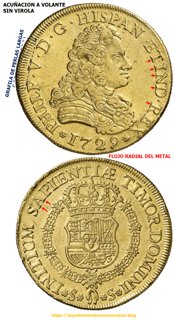 El siguiente DOBLÓN DE A 8. 1729. FELIPE V. TIPO CRUZ. SEVILLA. , Acuñado a Molino, permite comparar las perlas de la grafila con la de la pieza acuñada a Volante.