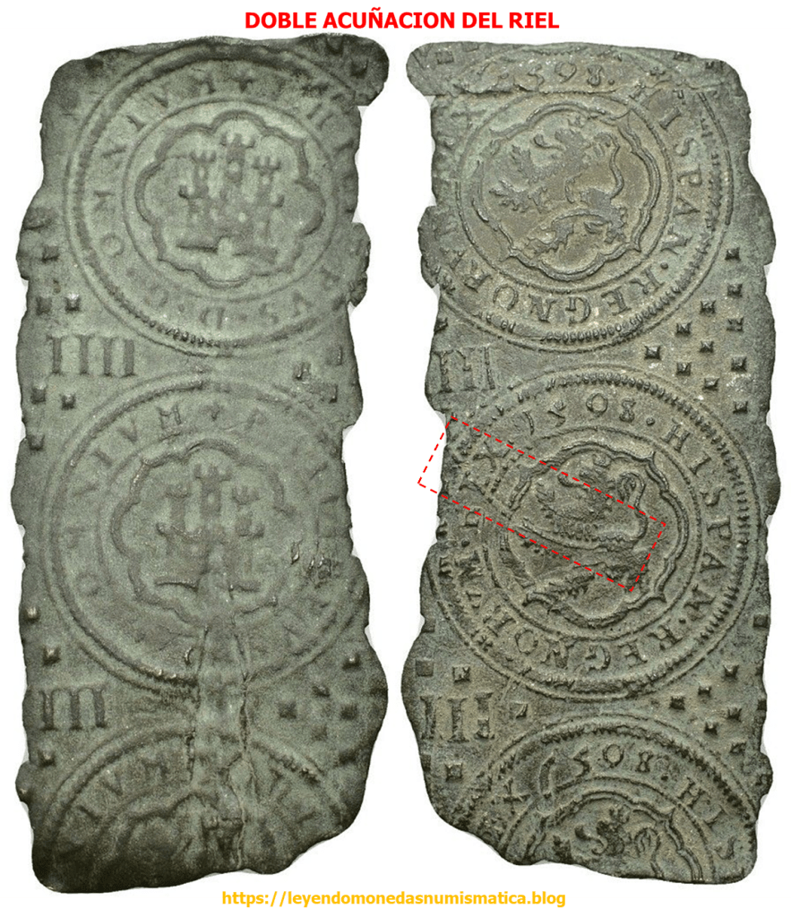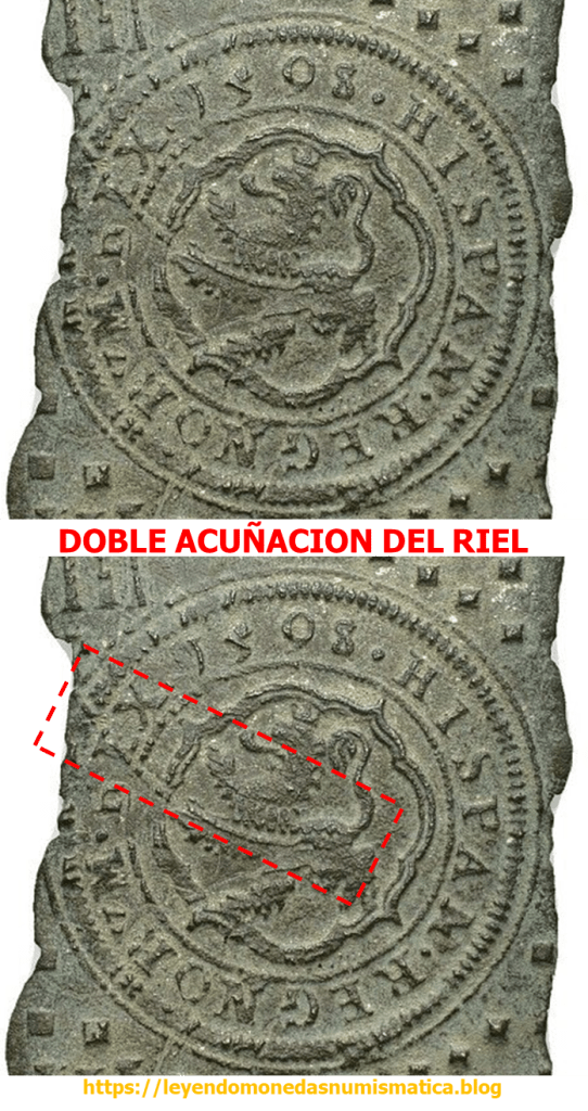 El siguiente riel, acuñado a molino, tiene un detalle que se aprecia en algunas monedas acuñadas a molino. El riel ha pasado dos veces por entre los Cuños Rodillo. El riel ha sido acuñado dos veces. Es Una Doble Acuñación del Riel.