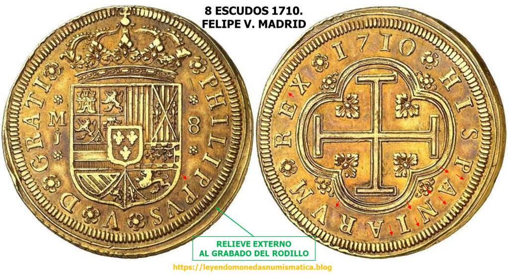 Los siguientes Doblones de a 8, fueron acuñados a Molino en la Ceca de Madrid, en 1710. Conozco 4 ejemplares. Los 4 Doblones de a 8 comparten mismo Grabado de anverso y de reverso. La posición de los relieves, es la misma, tanto para el anverso, como para el reverso de las tres piezas. El cerrillado del canto, una vez recortado el riel acuñado, ha dejado en algunas áreas, el borde de las tres piezas alzado.