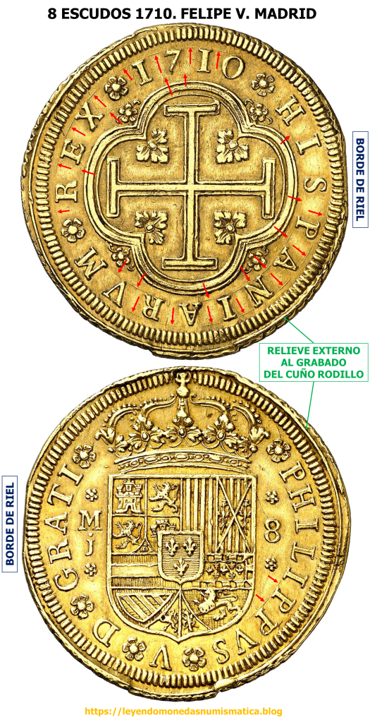 En ambas caras de los Doblones de a 9, podemos leer detalles en relieve alrededor de la leyenda. Mucho mas obvio en el reverso de las cuatro Onzas. La flechas rojas señalan dichos detalles. Parece que desde el centro del grabado se trazaron dos elipses para emplazar la leyenda de ambas caras. Estas elipses señaladas por las flechas rojas son parte del proceso de elaboración del Cuño rodillo. Son detalles, que pertenecen a la operativa a la hora de elaborar cada grabado en el rodillo. Son detalles que parece ser, que sirven de guía, de referencia, a la hora de emplazar las siglas de la leyenda. La leyenda esta situada entre ambas elipses del cuño Rodillo. Ayudan al operario a situar los diferentes bajorre-lieves, a través del hincado de los punzones que conforman la leyenda del grabado (cara de la moneda).