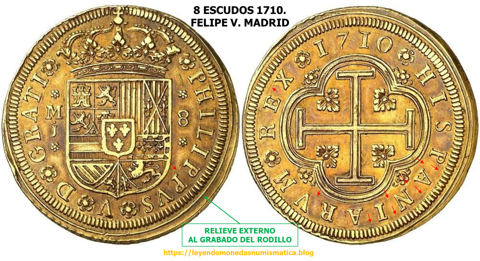 Los siguientes Doblones de a 8, fueron acuñados a Molino en la Ceca de Madrid, en 1710. Conozco 4 ejemplares. Los 4 Doblones de a 8 comparten mismo Grabado de anverso y de reverso. La posición de los relieves, es la misma, tanto para el anverso, como para el reverso de las tres piezas. El cerrillado del canto, una vez recortado el riel acuñado, ha dejado en algunas áreas, el borde de las tres piezas alzado.