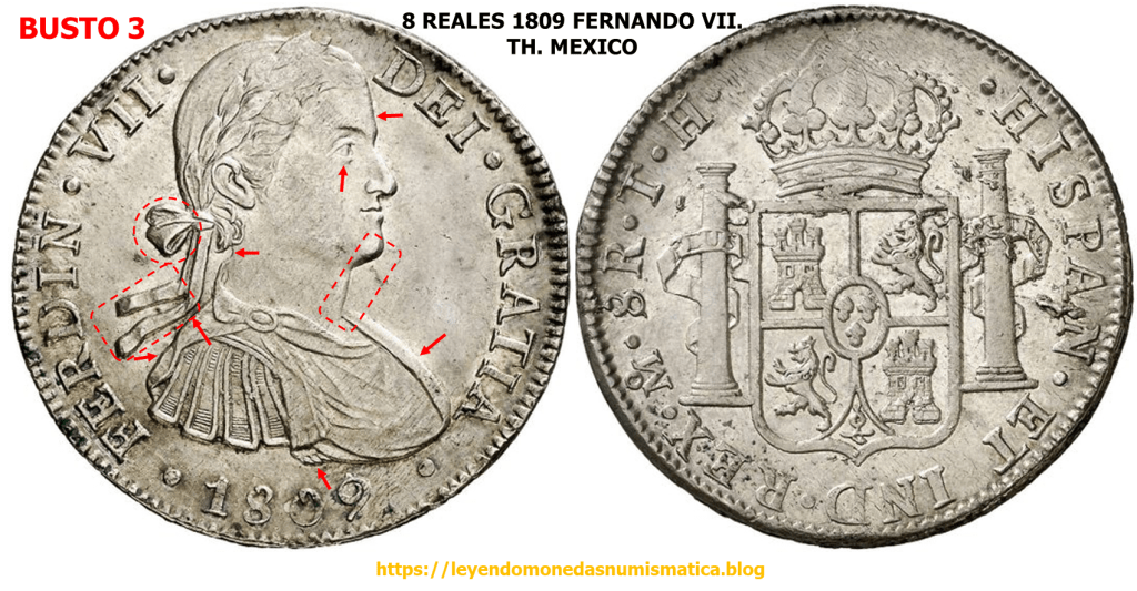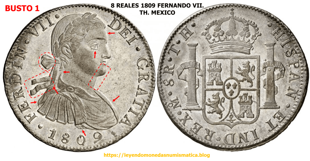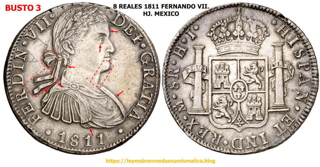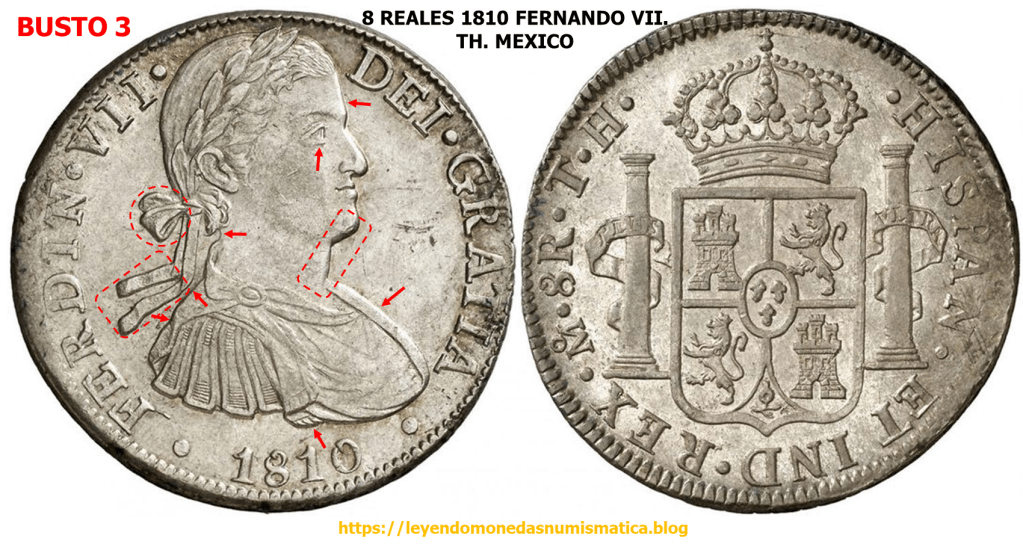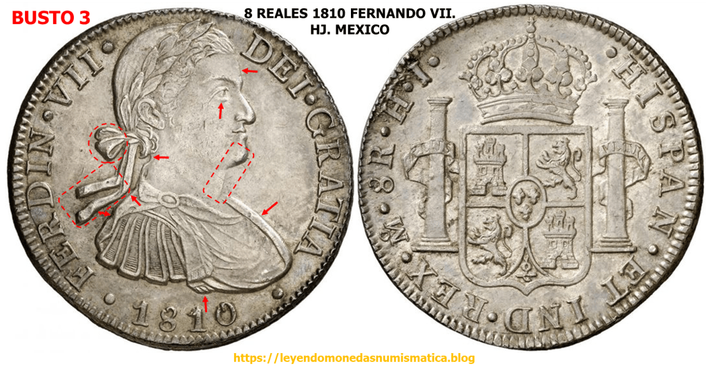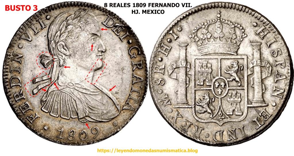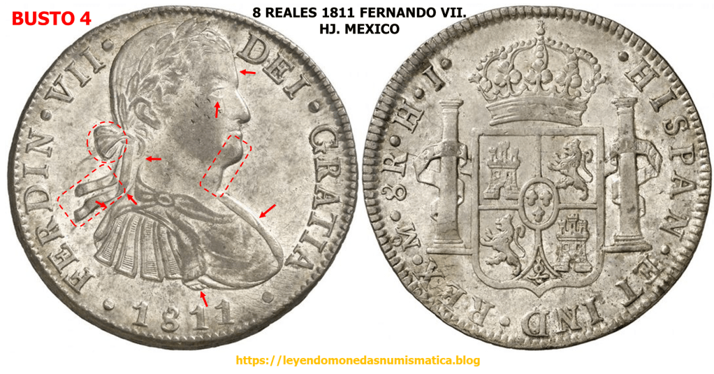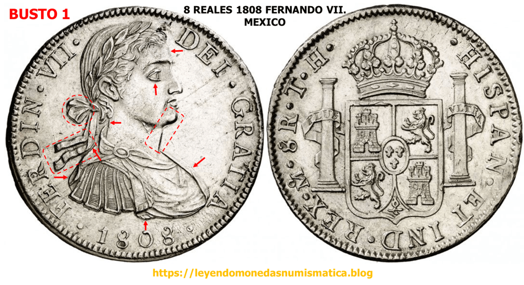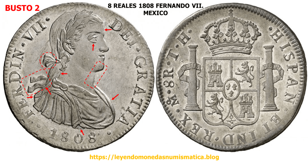 Las piezas Busto Imaginario acuñadas en plata, en 1808, 1809, 1810 y 1811, con valor 8 Reales, en la Ceca de México tienen diferentes Bustos. La Túnica/Toga es el lugar mas sencillo para diferenciarlos. Las ínfulas también ayudan a diferenciarlos.