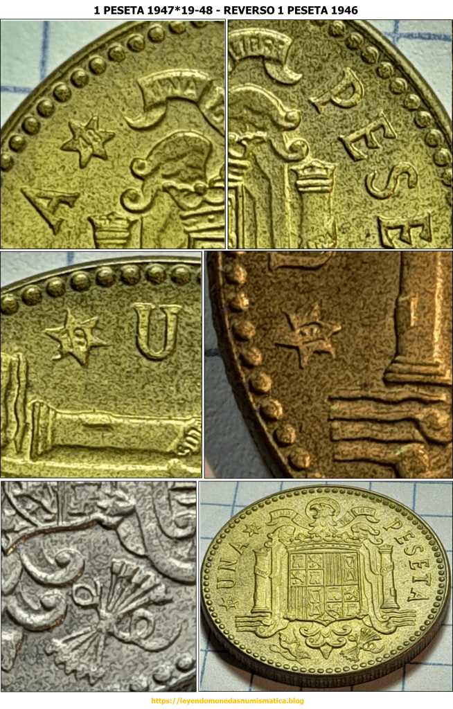 La peseta de 1947 con estrella 48, tiene una variante, que no es recogida todavía en catálogos. Dicha variante cuenta con el reverso de la peseta 1946 (1 Peseta 1946*19*48. Su REVERSO, y CUÑO DOBLADO en Anverso.).
