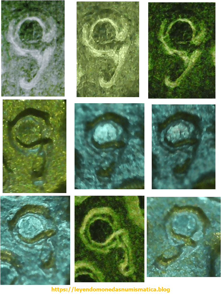 El trazo rojo es un detalle que en principio, se encuentra en el 9 de estas piezas. Los lectores de esta entrada, que tengan en sus colecciones esta pieza, 100 pesetas 1966*69 Palo Curvo, podrán comprobarlo en sus piezas. Seria muy didáctico, y de agradecer, para mi y el resto de coleccionistas de estas piezas, que confirmasen el detalle. Es una linea en bajorrelieve. Yo la he visto en las piezas que he tenido en mano. Lo señalo en las fotos, pues también se ve en ellas. Leer ese detalle en el 9 es revelador en principio. No puedo afirmar que se aprecie en todas las piezas. ¿Por que?. Por que como es obvio, no he tenido en mano todas las piezas acuñadas.