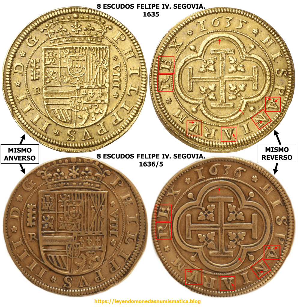Encontrar en 1835 y 1836 piezas de 8 Escudos con el mismo reverso, lleva a pensar en una reutilización del Cuño Rodillo de reverso a través de la rectificación de fecha (Puntos 2 y 3). Ademas el punto 2, señala parte del diseño del dígito 5, que aun se percibe en el Doblón de a 8 acuñado en 1836.