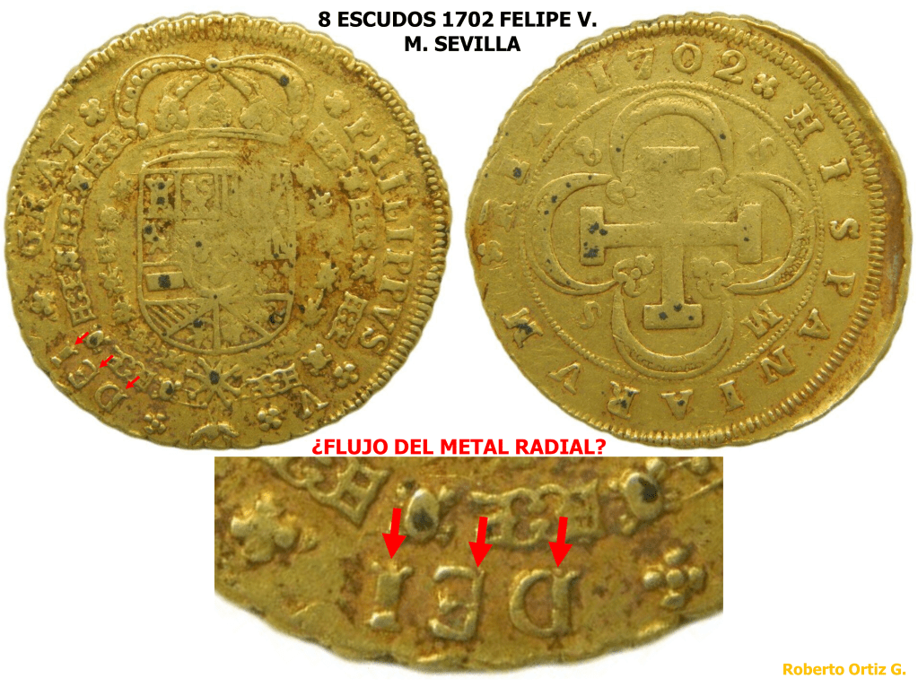 Las bases de las letras no están completas. El metal no penetro enteramente o no relleno totalmente el huecorelieve de las tres siglas señaladas, por las flechas rojas. El detalle se parece al que encontramos en otras piezas acuñadas a Volante sin Virola. ¿Significa esto que este Doblón de a 8 fue acuñado a Volante?. Parece que si. Hay otro detalle para pensar en la Acuñación a Volante – 8 ESCUDOS 1705 FELIPE V. SEVILLA. DOBLE ACUÑACION.
