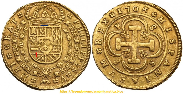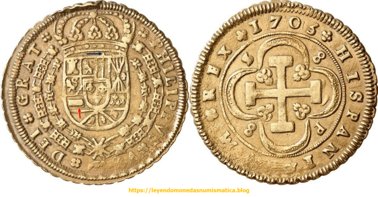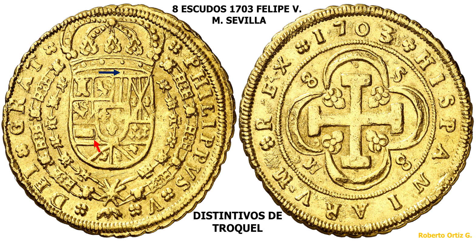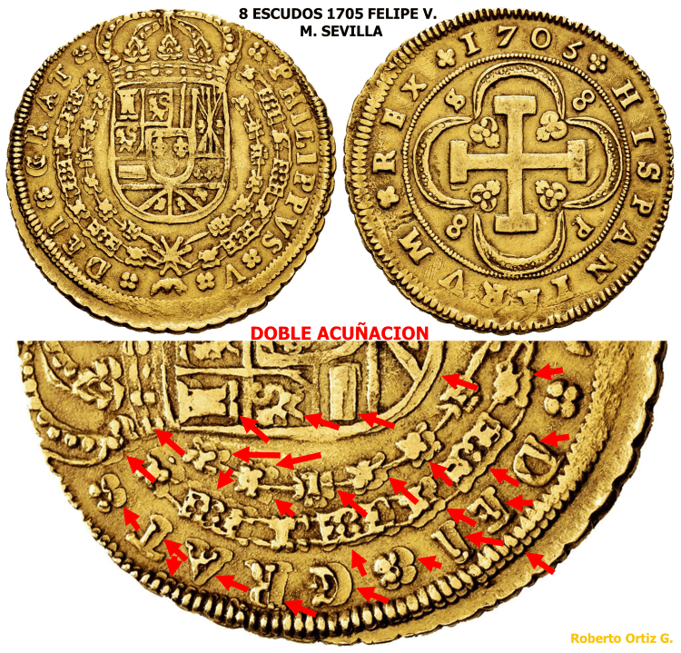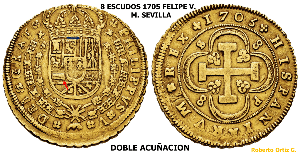 La Doble Acuñación en el Doblón de a 8 Sevillano, delata que la técnica de acuñación fue el Volante. Como el anverso es el mismo en las piezas anteriores, eso nos lleva a decir, que la técnica de Acuñación a Volante, se usaba ya en Sevilla, al menos en 1703.