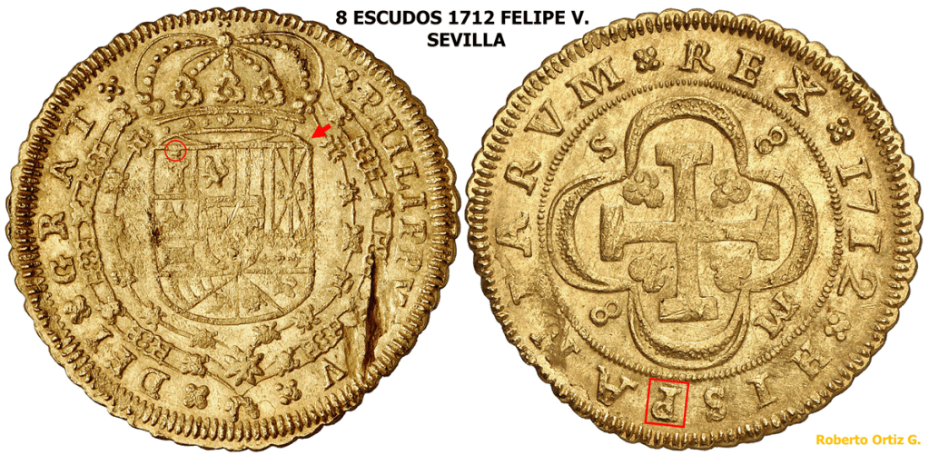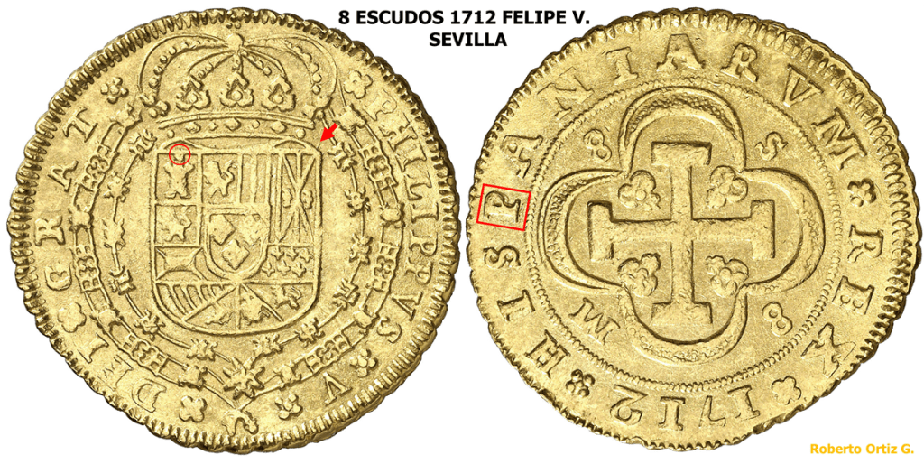 Los dos siguientes Doblones de a 8 Sevillanos, acuñados en 1712, presentan un detalle, que delata la Técnica de Acuñación empleada, para su fabricación en la Ceca.