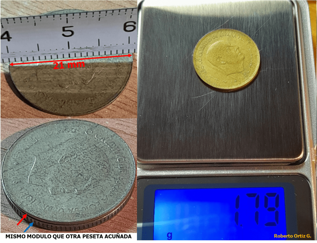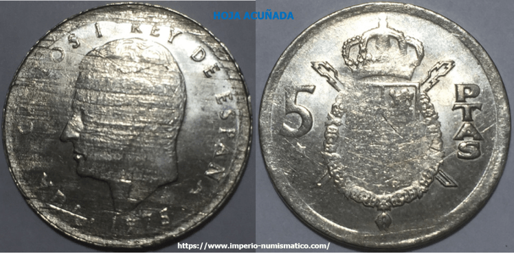 Ambas caras están acuñadas, luego el cospel entro en la cámara de acuñación de la maquina prensadora. El Cospel fue acuñado, un cospel delgado, un cospel mas fino. Detalles que presenta la Peseta: