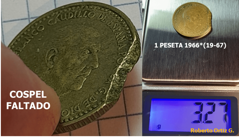 A continuación, 1 Peseta de 1966, con un falta de metal en su borde (canto).