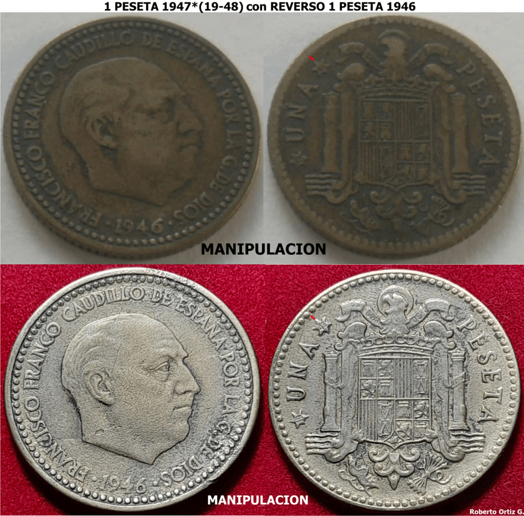 Las Pesetas 1947*(19-48), se manipulan en su anverso (fecha), para hacerlas pasar por 1 Peseta 1946*(19-48). En principio, con un poquito de estudio, de las piezas genuinas, es sencillo detectarlas. 1 Peseta 1946*19*48. Su REVERSO, y CUÑO DOBLADO en Anverso.